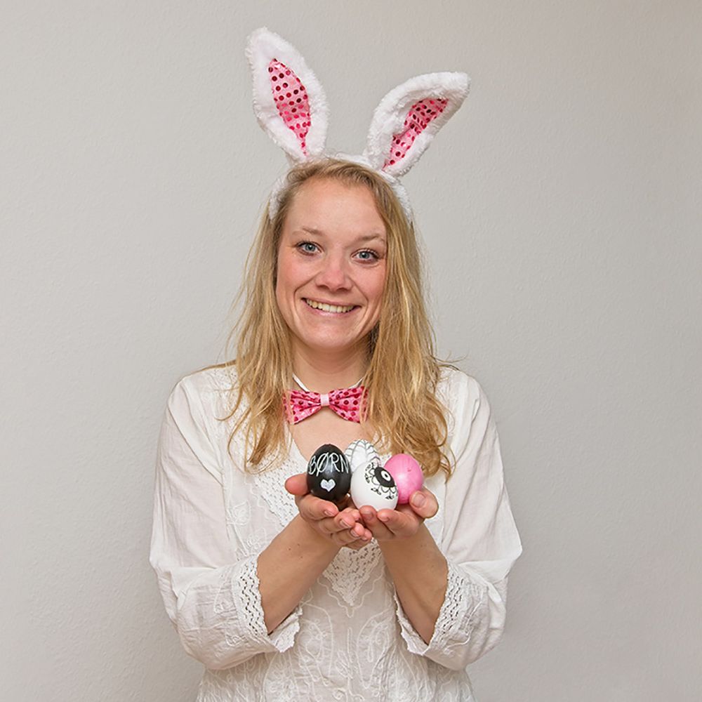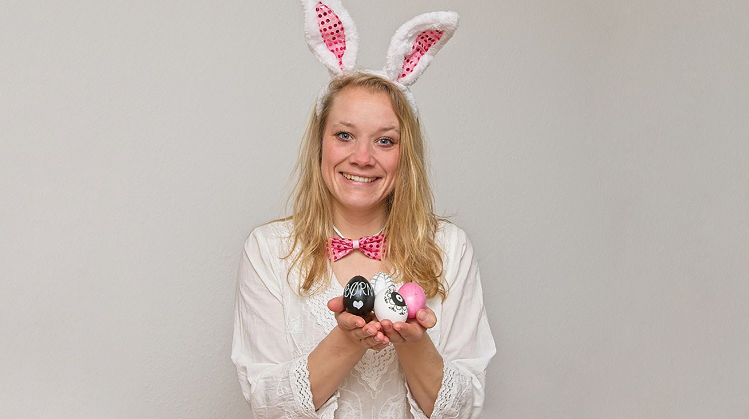Udklædt som påskehare inviterer Leela børn og deres familie til hyggelige påskeløjer.