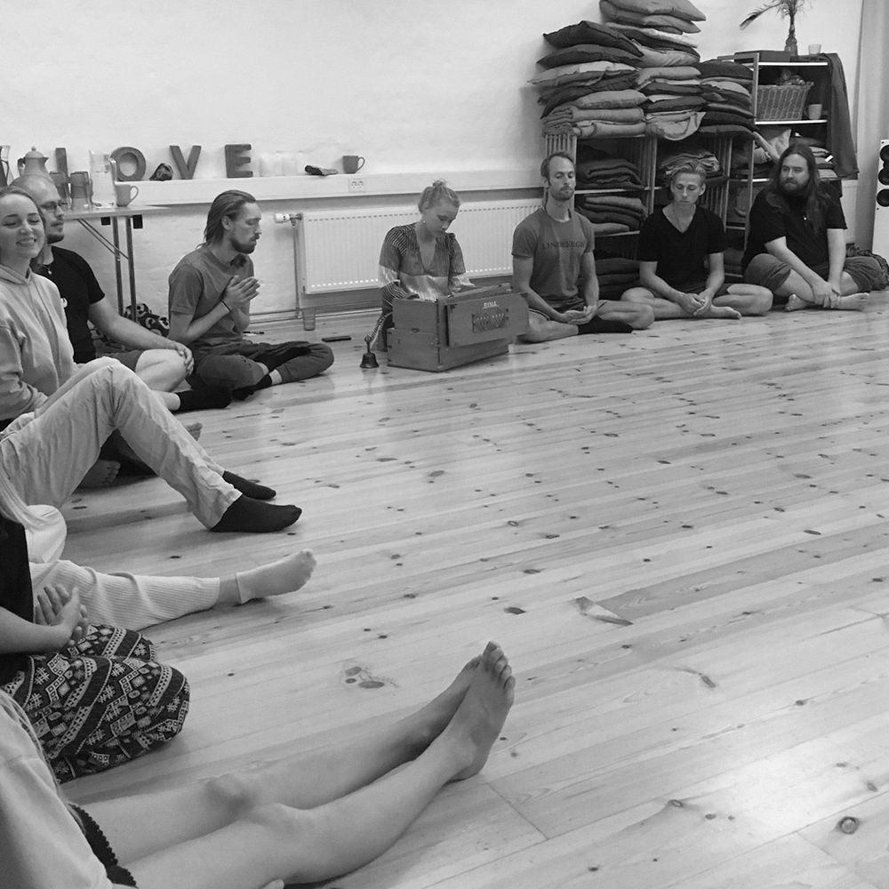 Der er en dyb meditativ forbundethed i rummet. Jeg føler mig fuldstændig blød og balanceret efter mantrasang.